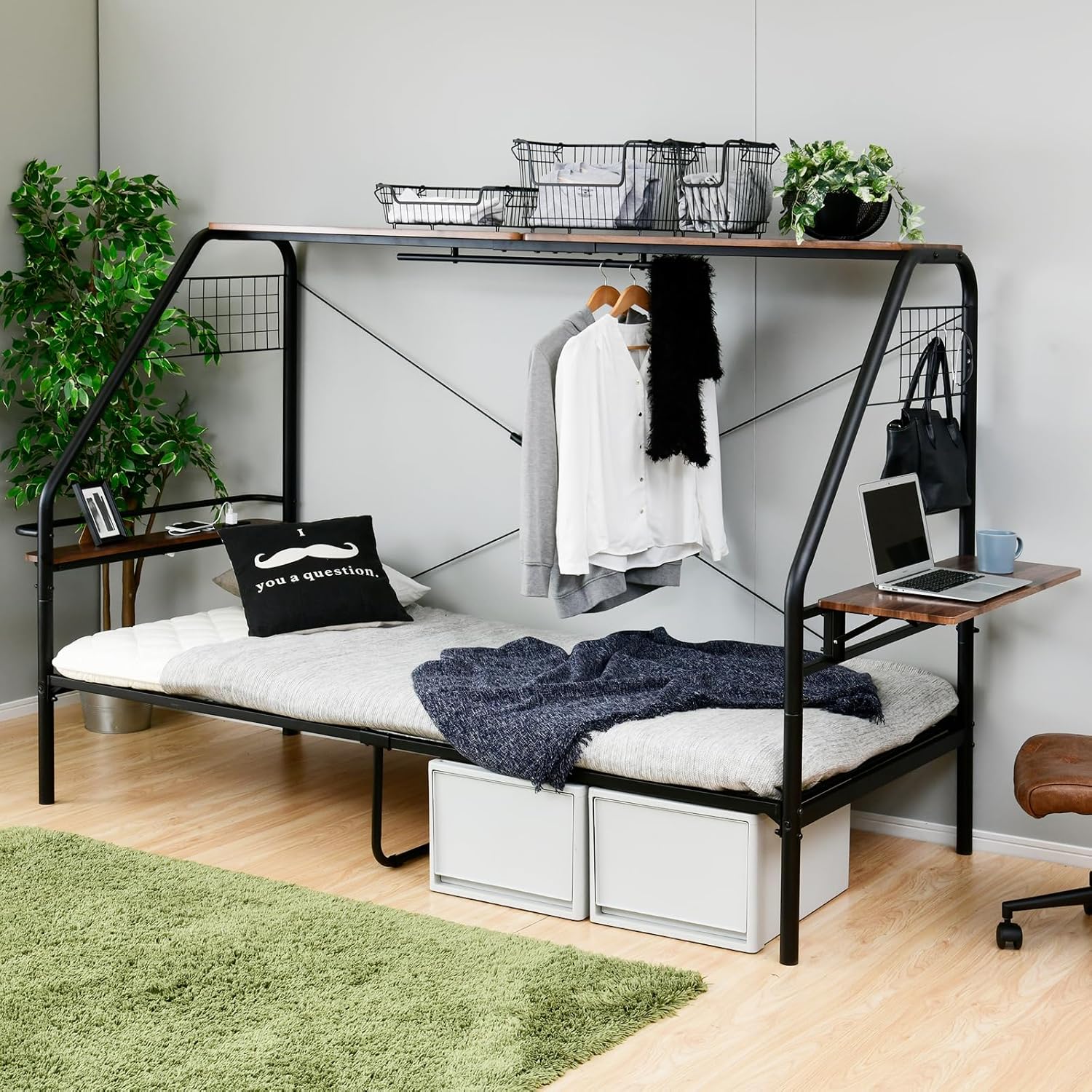 このベッドは、あなたの生活空間を一変させるアイテムです。テーブル付きで、ベッドに座ったままPC作業やお食事ができるので、特に一人暮らしの方にはぴったり。狭い部屋でも有効活用できるデザインが魅力です。ハンガーバーも付いていて、衣類を選ぶのも楽ちん。収納スペースも豊富で、上部には棚があり、小物や季節外の衣類をスッキリ収納できます。これがあれば、ベッドから動きたくない日も安心です。